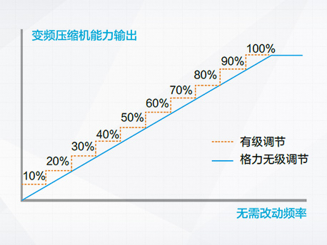 輸出能力無級調節(jié),直流變頻壓縮機能夠在20Hz~120Hz范圍內做到數(shù)字化無級能量調節(jié)。