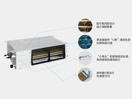 廚享內(nèi)機(jī)采用金色防腐翅片換熱器,抗腐蝕能力強(qiáng),翅片采用寬間距設(shè)計,可減少油煙附 著:換熱器采用V型設(shè)計,使風(fēng)速更均勻。