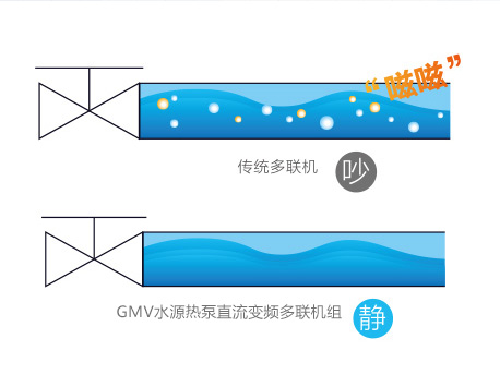 傳統(tǒng)機組在冷媒流量調節(jié)時會發(fā)出類似“茲茲”的液流噪音,GMV水源熱泵直流變頻