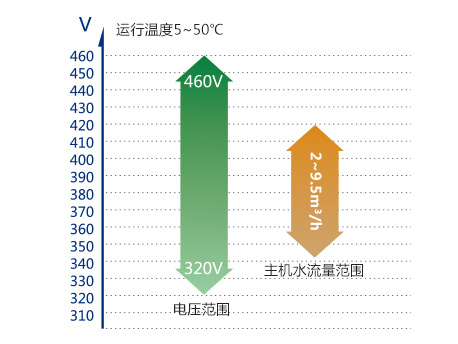 水側換熱器進水范圍:5~50℃,主機水流量范圍:2~9.5m3/h,滿足全國大部分地區(qū)的地理環(huán)境使用要求;