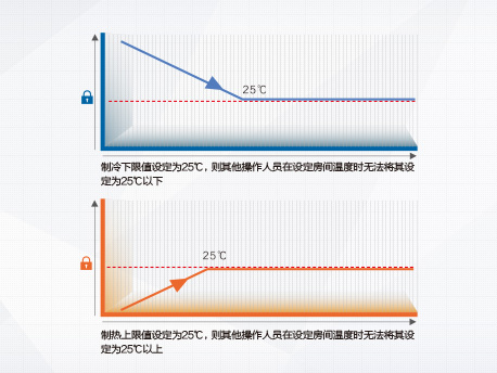 可通過線控器設置制冷下限值和制熱上限值,防止公共場所隨意調節(jié)空調造成能源浪費。